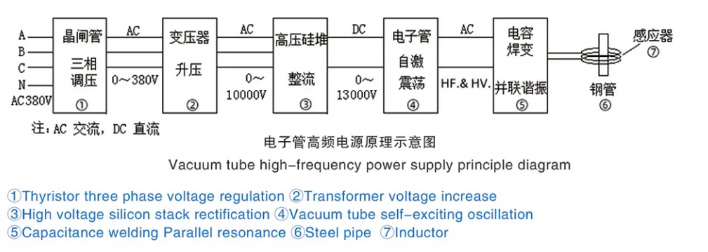 AC معمولی صنعتی (سه فاز چهار سیم 380 ولت / 50 هرتز در چین) از طریق تنظیم کننده ولتاژ AC تریستور به AC قابل تنظیم در محدوده 0 تا 380 ولت (فرکانس بدون تغییر) تبدیل می شود و سپس تا نزدیک به 10000 ولت افزایش می یابد و توسط یک فرکانس بالا تغییر می کند. مدار یکسو کننده ولتاژ به ده ها هزار DC ولتاژ بالا، و سپس توسط لوله خلاء به جریان HF و HV، و سپس از طریق رزونانس موازی LC برای تقویت جریان نوسانی، و پس از کاهش ولتاژ منبع تغذیه به سلف مورد استفاده برای گرم کردن لوله های فولادی و سایر قطعات کار و غیره می شود.