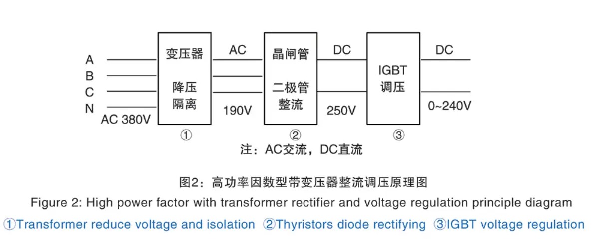 1. طبقه بندی با تنظیم ولتاژ یکسو کننده: تریستورها (SCR) می توانند برای تکمیل یکسوسازی و تنظیم ولتاژ همزمان استفاده شوند، یا ابتدا از دیود یا تریستور یکسو کننده استفاده کنند و سپس از ولتاژ تنظیم IGBT استفاده کنند. استفاده از ولتاژ تنظیم IGBT برای بهبود ضریب تجهیزات است. می تواند در مصرف برق صرفه جویی کند و کیفیت جوش را بیشتر بهبود بخشد.